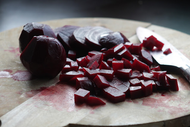 Ik had voorgekookte bietjes gekocht, omdat het toch koud gegeten werd, maar je kunt ze natuurlijk ook prima zelf koken. Boen ze in dat geval goed schoon, maar schil ze niet (dan verliezen ze hun mooie rode kleur) en dompel ze in water tot ze onder staan. Laat ze zachtjes een uur koken tot ze gaar zijn.